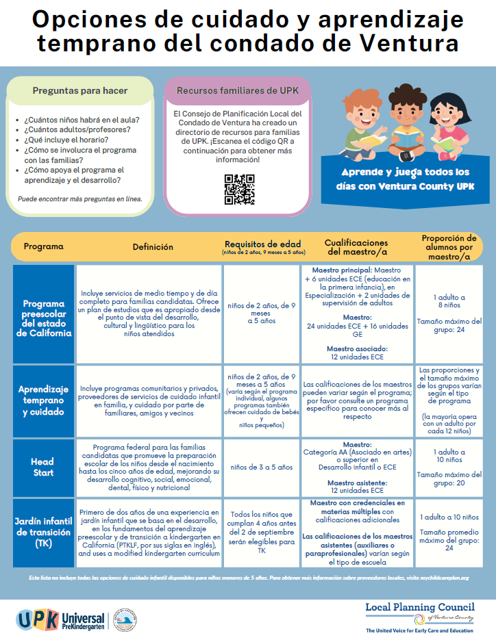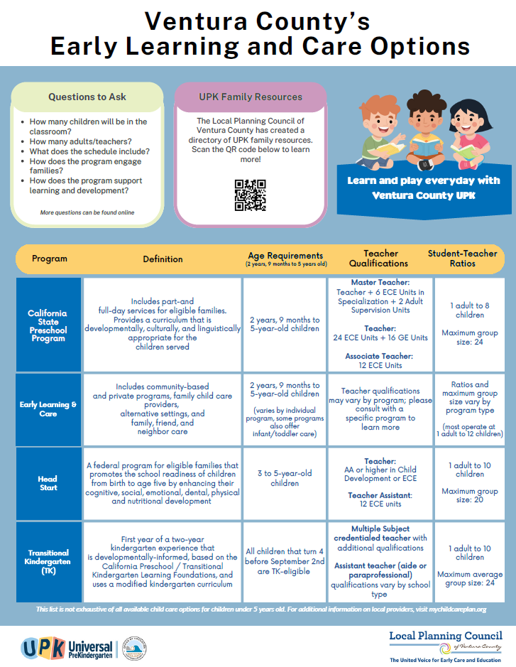 To learn more about transitional kindergarten (TK) and Universal PreKindergarten (UPK), visit the Ventura County Office of Education.